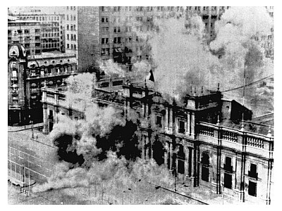 le Palais présidentiel de la Moneda, bombardé, lors du coup d’état du 11 septembre 1973.
