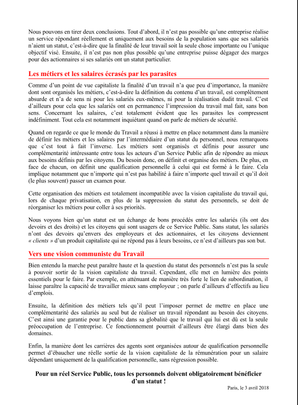 Seul le Travail est créateur de richesses, de valeurs. Il nous appartient, à nous en tant que Peuple, de décider de que nous voulons faire de ce que nous produisons par notre travail. En cela, le statut des cheminots, parmi d’autres, n’est pas une niche, il est un exemple et un point d’appui pour tous les salariés.